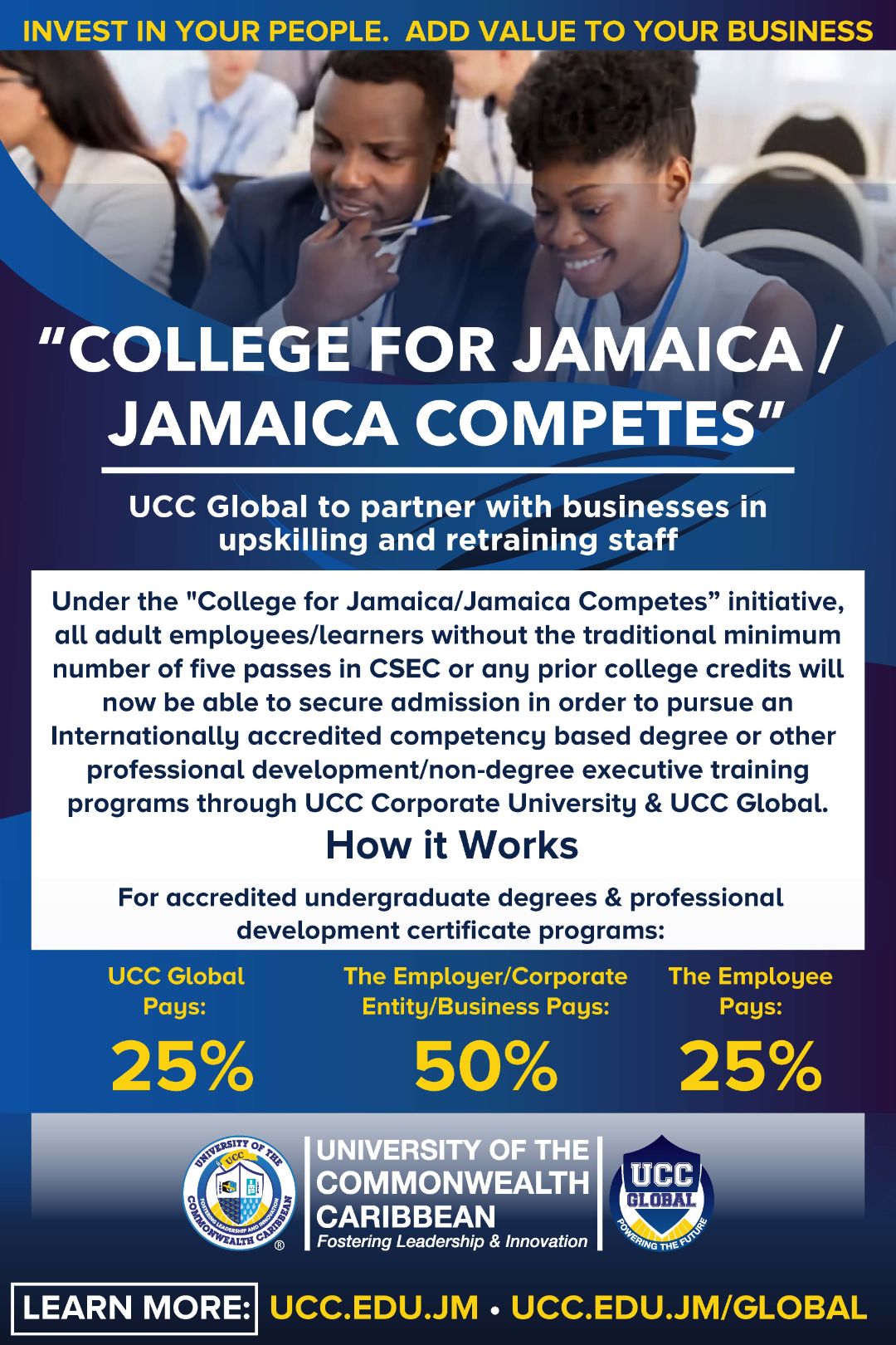 UCC Global Corporate University (UCCG CU), a division of the UCC Group, will be seeking to in partner with a major international organization to target thousands of businesses/employers and their employees/ potential adult learners across Jamaica, most of them without a degree or any college credits. Up to 70% of the Jamaican workforce is without a college degree!